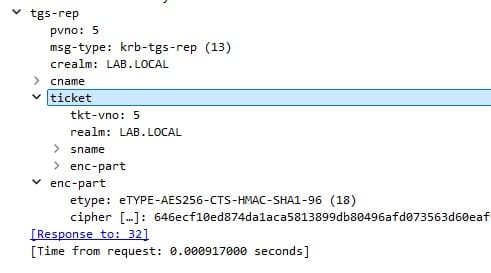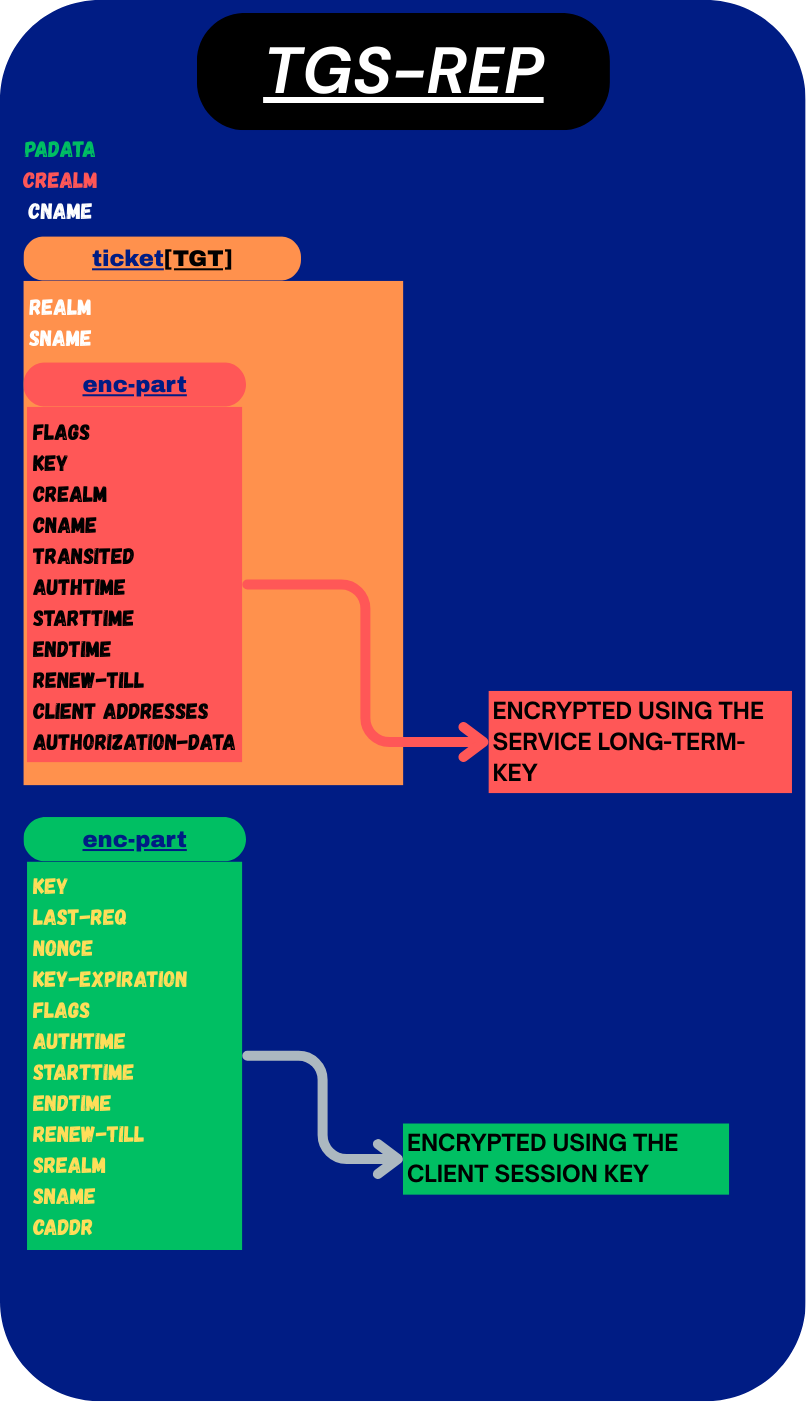 The TGS-REP is the KDC’s response to a TGS-REQ. In it, the KDC issues the client a valid Service Ticket, which the client will use from now on to authenticate to a specific service. The structure of this response is very similar to AS-REP.