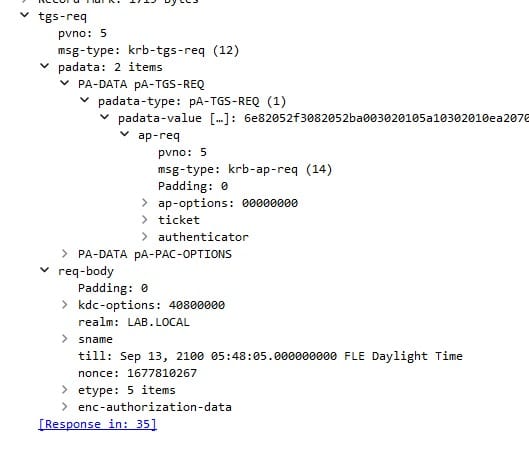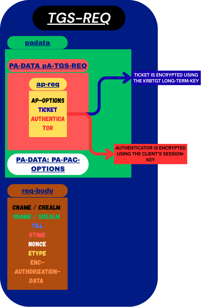 - PA-DATA pA-TGS-REQ → This field is one of the most important ones in this request it contains the TGT that the client received earlier and also an Authenticator. This proves to the KDC that the client is authenticated and owns the TGT.