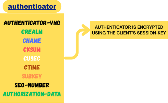 - authenticator → At its core, it contains the client’s identity(name and domain) and the current time, encrypted with the session key (the one obtained earlier in the AS-REP). This prevents ticket replay and proves the request is fresh. [EXPLAINED BELOW]